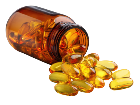 Herb supplement capsules on green leaf isolate on white background. Selective focus.