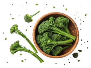 Fresh broccolini arranged beautifully in wooden bowl showcases its vibrant green color and healthy appeal, perfect for nutritious meals
