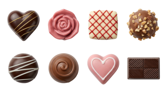 Gourmet chocolate truffle set including dark, milk, white, heart shaped, and nutty pralines isolated. Assorted confectionery and dessert collection.
