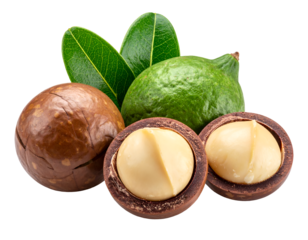 Freshly Harvested Nut: A close-up shot of several freshly harvested nuts, with one artfully cracked open, revealing its rich, nutty interior, hinting at a gourmet culinary experience.