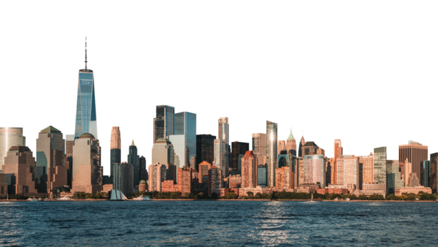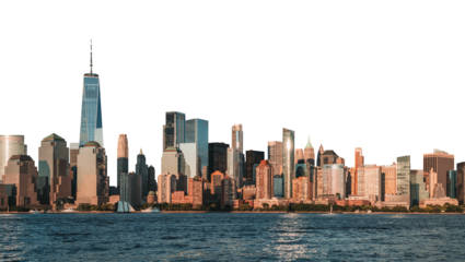 New York City skyline with modern skyscrapers and waterfront, isolated on a white background. Manhattan cityscape cutout for creative design or template use