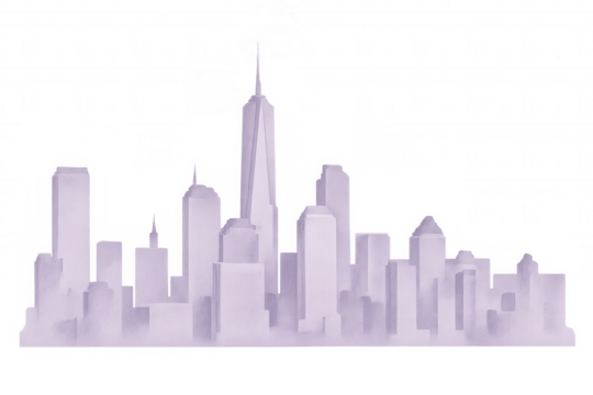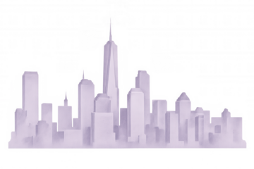 Watercolor artwork depicting nyc skyline with one world trade center, silhouetted against transparent backdrop, highlighting architectural elegance