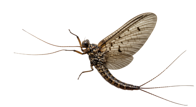 Detailed Mayfly with Veined Wings and Three Long Cerci Viewed from Below