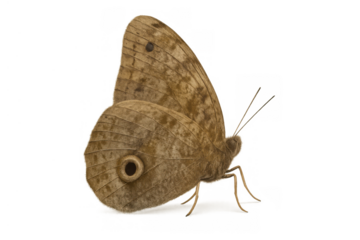 Brown wood nymph butterfly resting with folded wings and eyespot on transparent alpha channel background