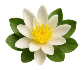two beautiful white water lily blooms surrounded by large green lily pads, floating peacefully on dark water, isolated on a transparent background.