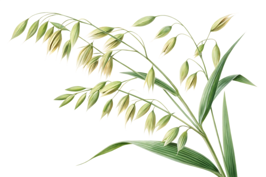Close-up photo of oat kernels with shiny golden husks, isolated on white background.