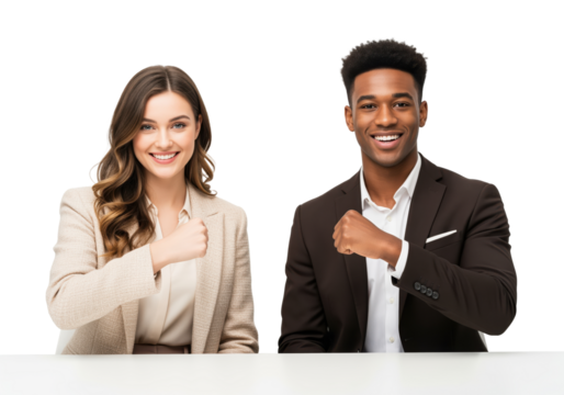 Oath pose with two employees holding a fist to the heart while expressing commitment and integrity for a code of conduct update on ethics governance, staff pledge and mission alignment values