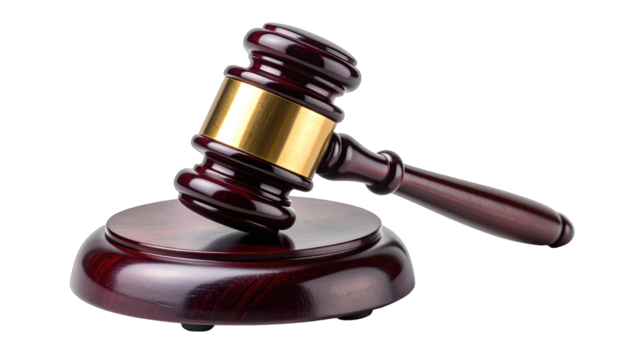 Close-up studio shot of a brown wooden gavel resting on its matching sound block