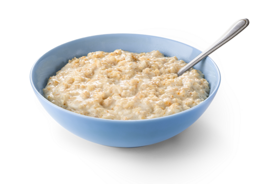 Creamy oatmeal in white ceramic bowl isolated on transparent background.