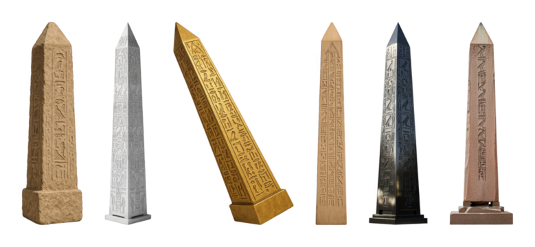 Ancient obelisk set including sandstone, granite, metallic, and gold variations isolated. Historical monuments and architecture.