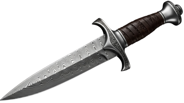Ornate dagger with Damascus steel blade isolated PNG, medieval weapon for fantasy games and historical reenactment on transparent background