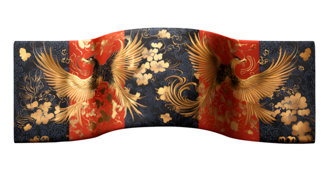 A colorful Japanese obi belt, silk material with gold embroidery of phoenixes, luxurious sheen, realistic fabric texture, isolated on transparent background