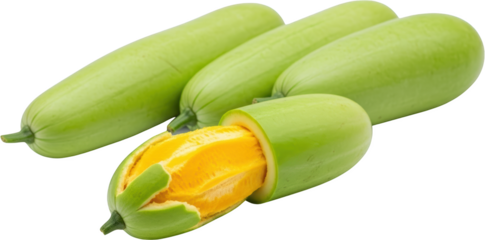 Four oblong green gourds one cut open revealing bright yellow flesh isolate