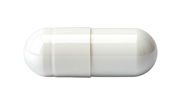 Close-up of a white, oblong capsule against a black backdrop