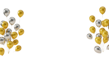 Festive celebration frame created with colorful helium balloons and falling confetti isolated on transparent background