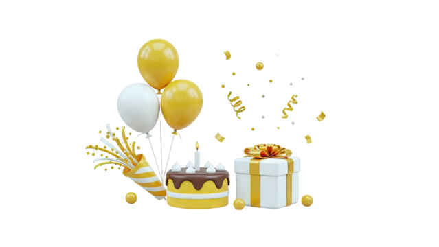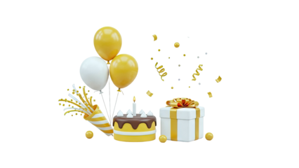 3D Birthday Celebration Elements: Cake, Balloons, Gift, Confetti, Popper on transparent background
