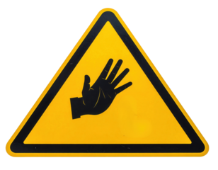 Yellow triangular warning sign showing a black hand symbol indicating a hand hazard and urging to stop or keep hands away.