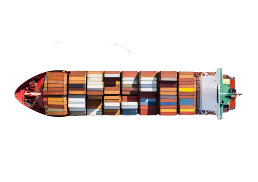 Cargo ship top view on white background, business in transport and logistics.