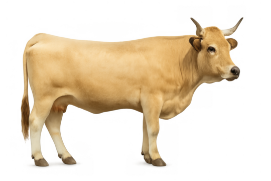 Pale yellow cow, a domestic bovine farm animal standing, isolated on transparent background, livestock concept