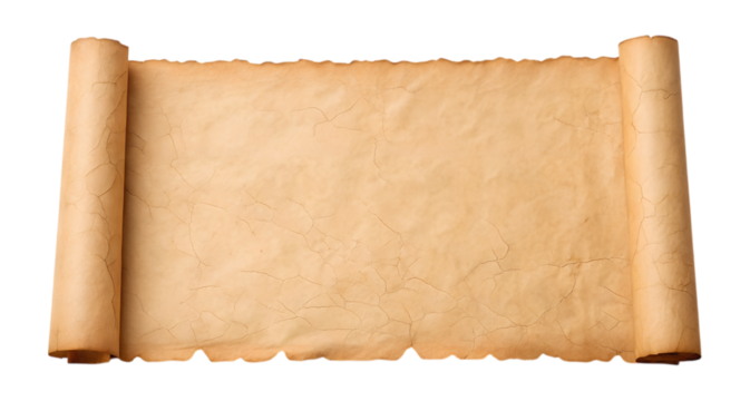 An old brown paper scroll is unrolled, displaying its aged textured surface. This horizontal ancient parchment is an isolated transparent PNG image.