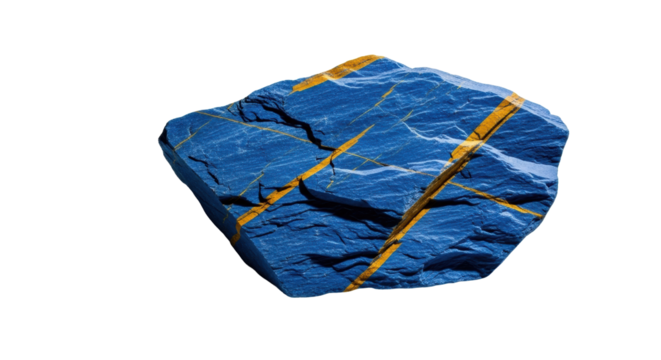 Raw, unpolished sapphire blue slate fragment with jagged ochre veins, fractured texture, on transparent with copy space and dramatic shadow, concept of geological power