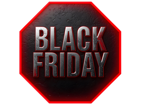 Black friday sale octagon sign with metallic text and red glowing border isolated on transparent background