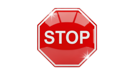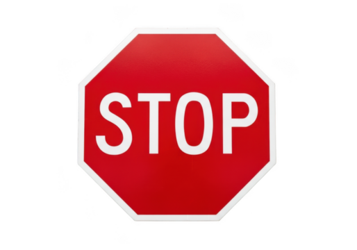 Red octagonal stop sign with white border and text, isolated on transparent background
