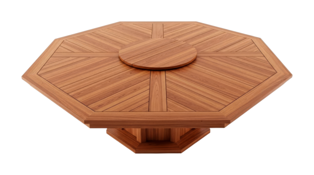 Octagonal wooden table with lazy Susan featuring a sophisticated geometric plank pattern and rich natural wood grain, presented from an elevated perspective.