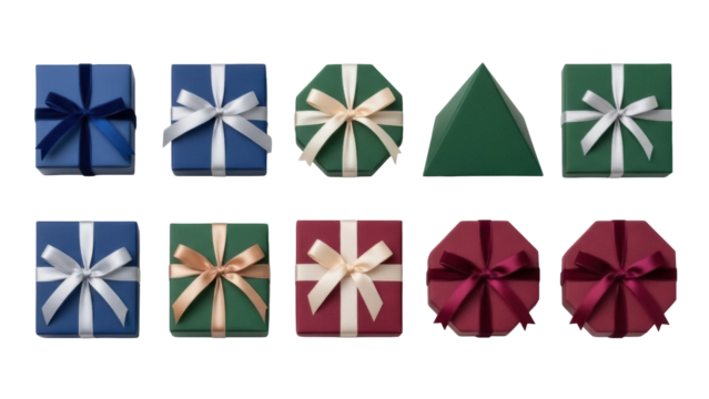 Seven distinct empty watercolor perfume bottles, varied shapes and colors, horizontal flat lay on transparent background with copy space, elegant product display concept