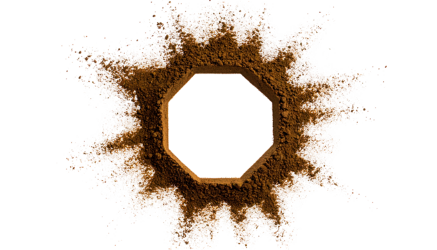 Abstract image of a brown explosion surrounding an octagonal frame on a black background