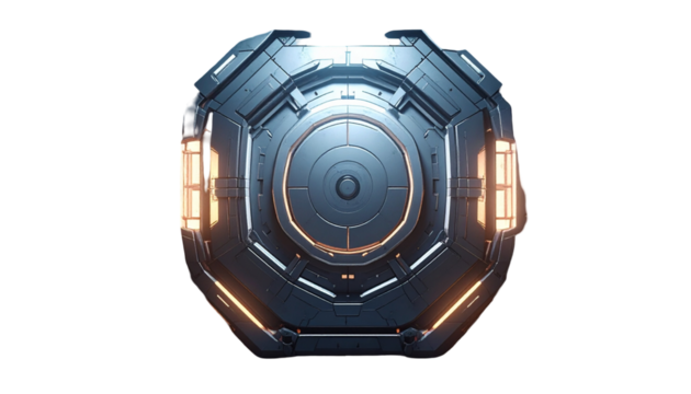 Metallic, octagonal sci-fi device with bright lighting and detailed design