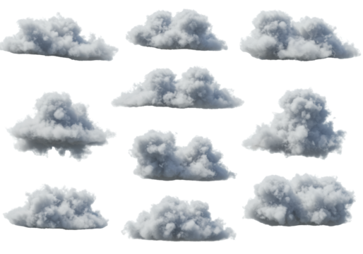 Twelve volumetric, hyperrealistic cumulus clouds arranged in a grid against a transparent background, showing detailed textures and volumetric light. Concept for technical meteorological visualization