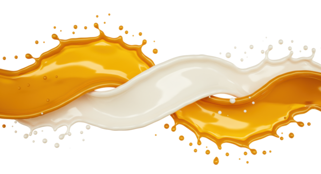 Dynamic splash of glossy orange-yellow liquid and dense white cream, intertwining with suspended micro-droplets on a sterile white background, concept for refreshing beverage advertising