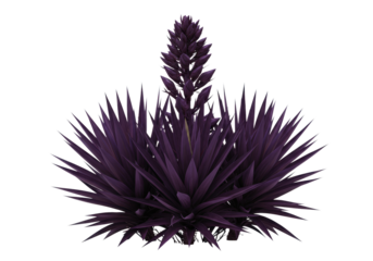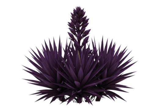 highly detailed, sculptural purple yucca plant (amethyst/obsidian tones) with rigid sword-shaped leaves and unopened buds, isolated on white, concept of modern arid flora design