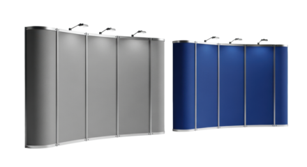 Two curved tension fabric exhibition stands (gray and blue) with focused led spotlights, side-by-side on a transparent studio floor, product visualization style. concept for corporate branding