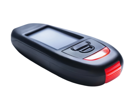 Speedometer with red needle on white face and blue markings isolated on a transparent background