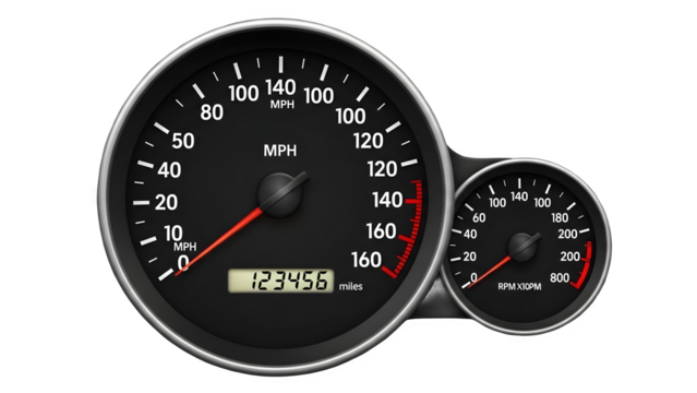 Isolated vehicle instrument panel displays engine speed, velocity and mileage indicators