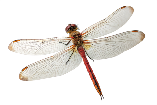 Detailed view of a light brown and white dragonfly with intricate wings isolated on transparent background