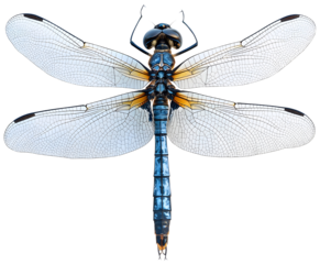 Blue dragonfly insect with transparent wings flying, isolated on transparent background illustrating nature and wildlife