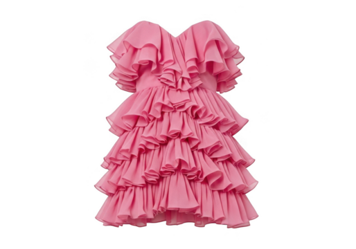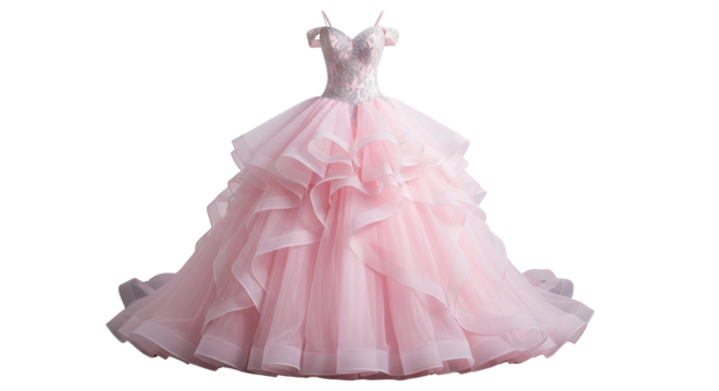 Pink voluminous ball gown wedding dress with ruffled tulle layers for fashion catalog isolated PNG with Transparent Background