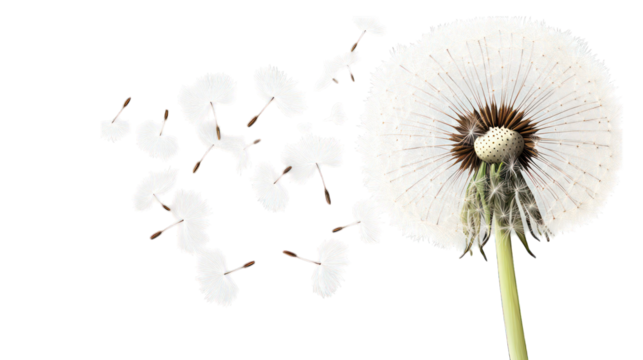 Dandelion seed head dispersing pappus seeds by wind, symbolizing wish, ephemeral nature, and freedom on transparent background