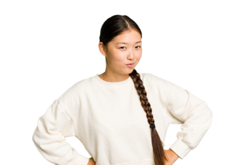 Young Asian woman isolated on green chroma background frowning face in displeasure, keeps arms folded.