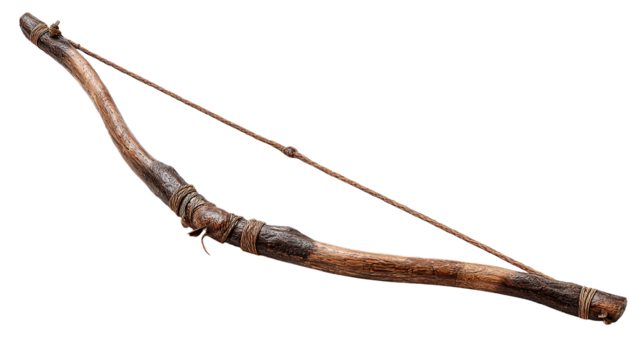 A detailed view of a handcrafted wooden bow ready for action or display.