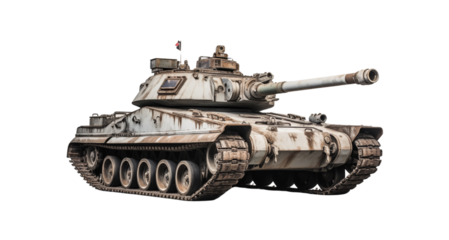 A detailed image of a battle tank with a long barrel and camouflage paint, isolated on a transparent background. Generative AI