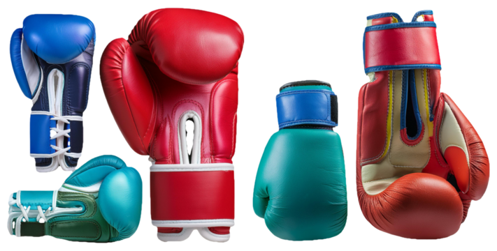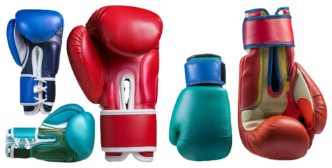 Assortment of colorful boxing gloves in various positions isolated on transparent background