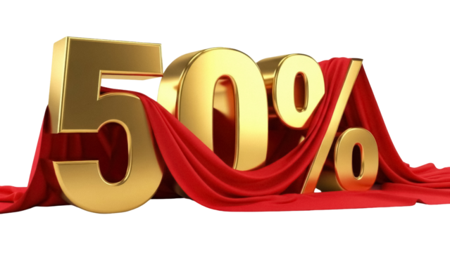 Golden 50 percent sign with red fabric isolated PNG, promotional sale design element on transparent background for marketing campaigns