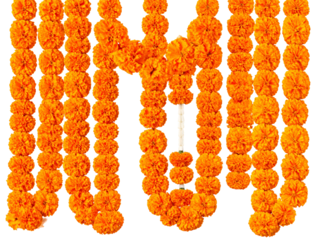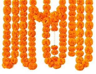 Vibrant orange marigold flower garlands arranged in a decorative pattern