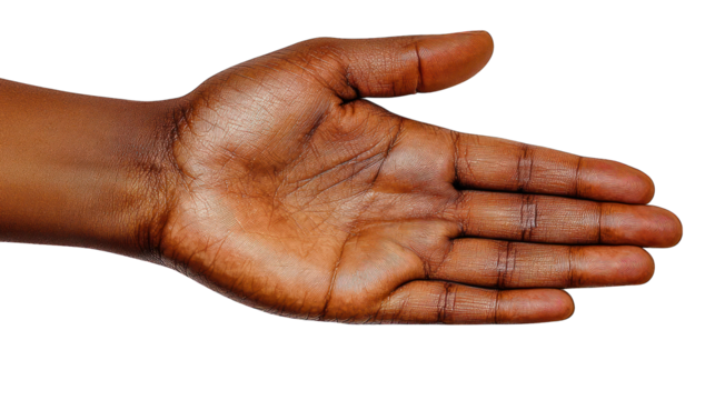 Open dark skin hand offering gesture on black background