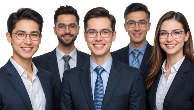 Group of five diverse professionals smiling in business attire against a  transparent  background