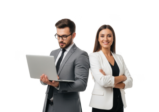 Professional man and woman in business attire standing together with a laptop isolated on transparent background